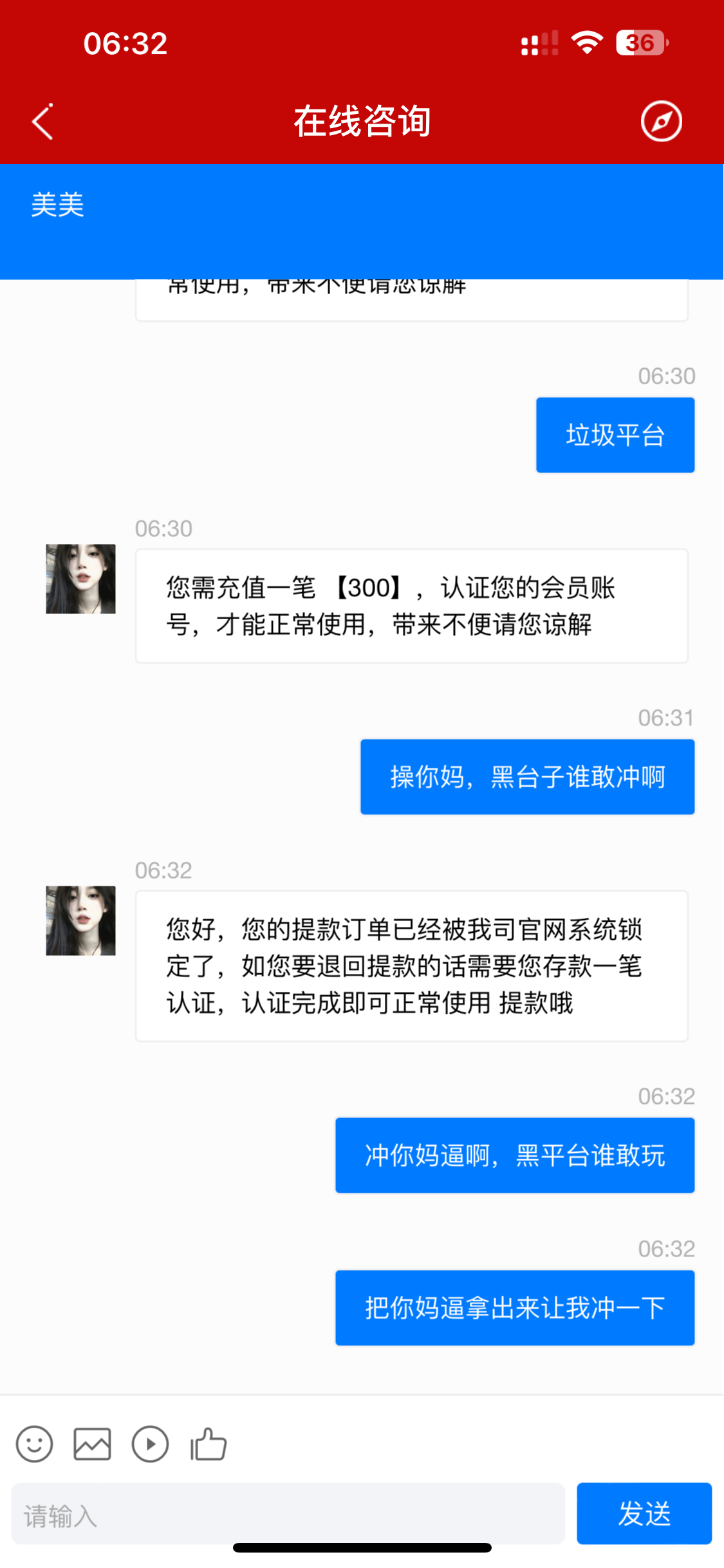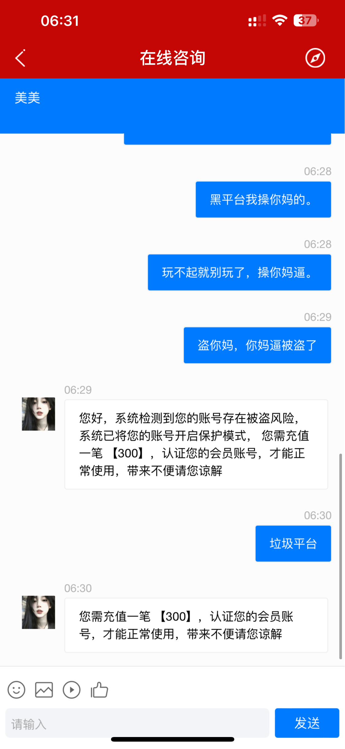 垃圾平台。一注册就给我来一个盗号打了三百不给我 以后这种短信千万不要相信。全是黑台子。昨天被骗了50块。今天充了150提300。说我被盗号了