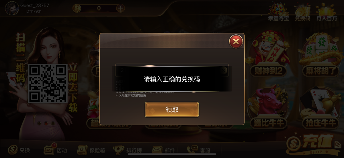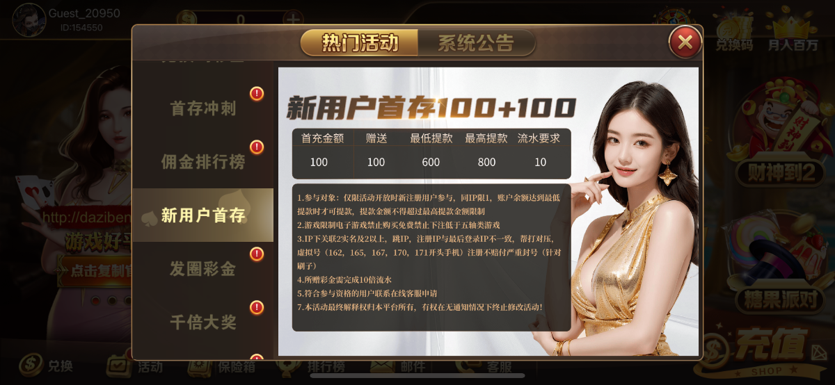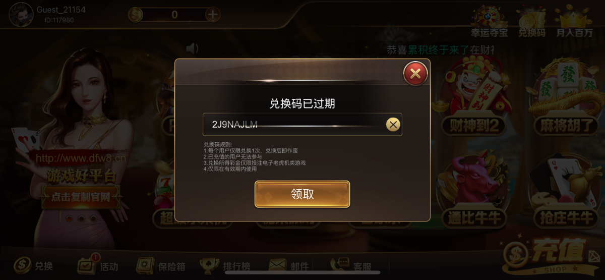 新用户注册下载右上角输入兑换码秒领8~88,兑换码在下方领取,没有金币的在本站首页签到一下就有了,一人仅可领取一次,出款查IP的,请不要刷号领取。首存100送100。