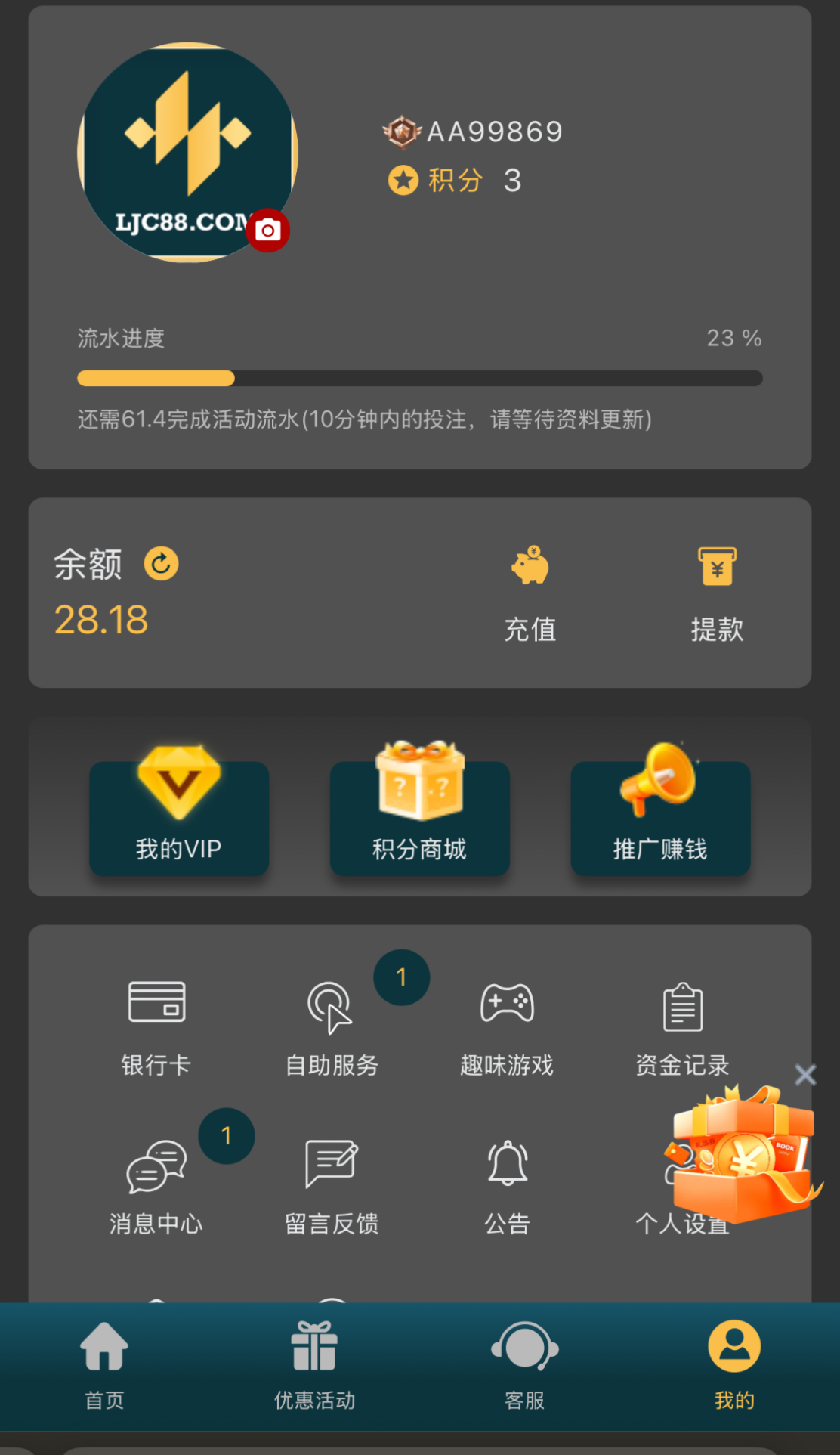 这个乐金城我天天玩怎么很少有回馈,每天都能领个5块,今天领了15提了2张,最近这个台有点黑
