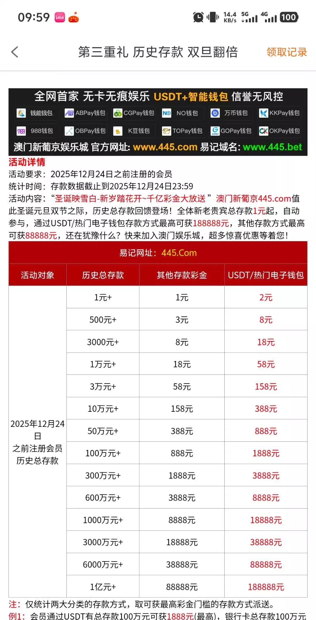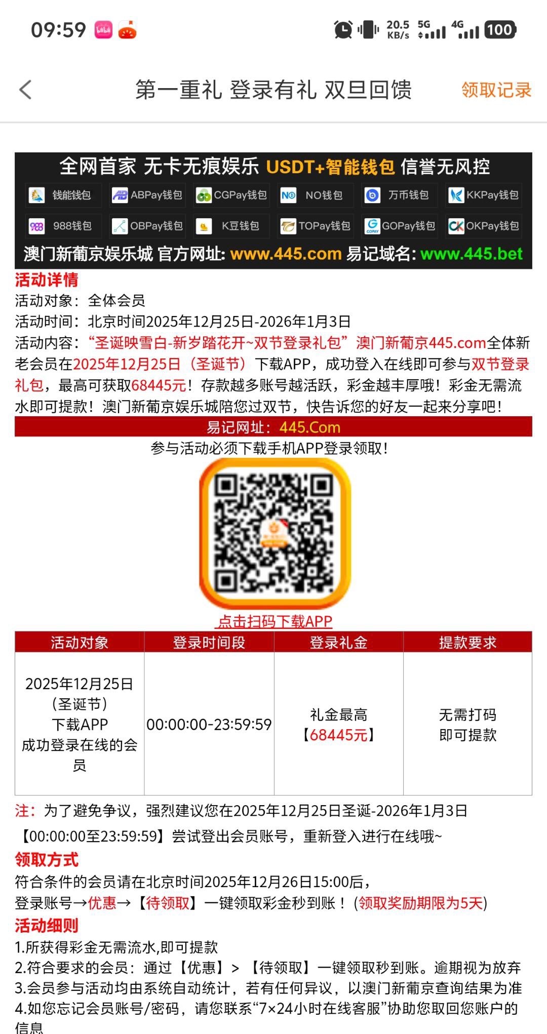 新葡京445 25号下载APP登录第二天下午三点领取双旦回馈礼金,有历史总存款的还有存款彩金。 网址: www.445.com