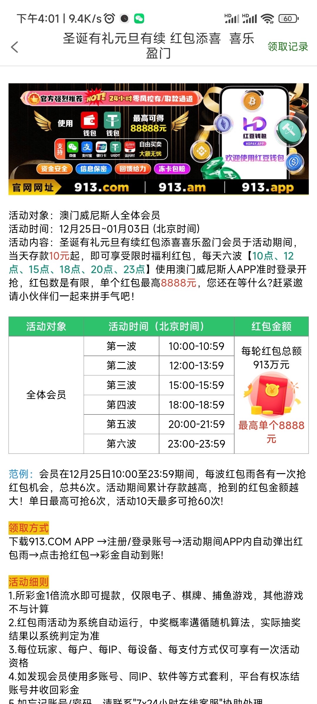威尼斯913每日6波红包