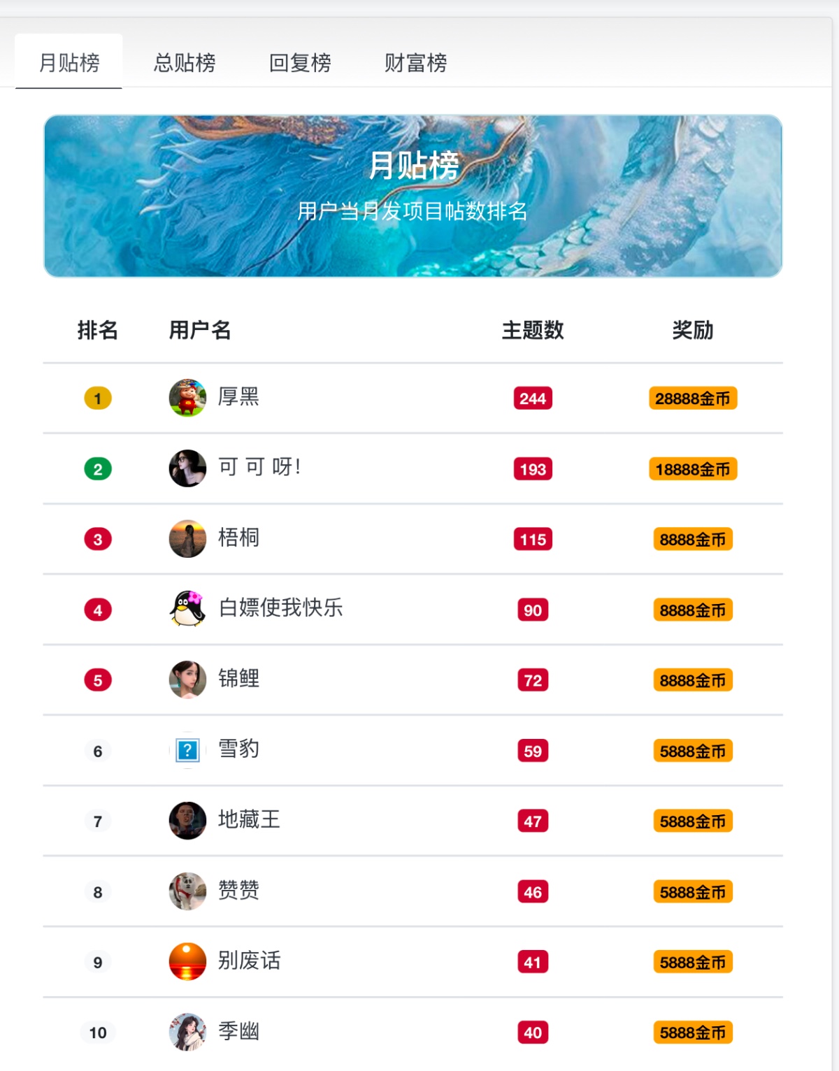 对当月发帖和活跃用户进行嘉奖