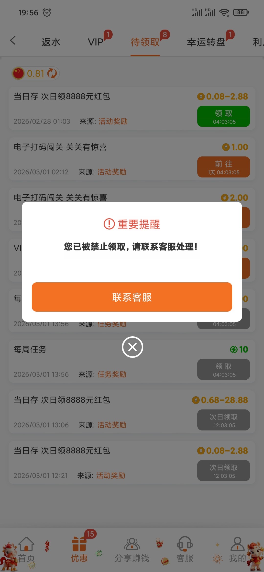 好久没被这种台子恶心了,福利都给我禁止了。就是因为我天天玩以小博大30+29,现在把活动什么都给我禁止了,等级降了不说,客服也是恶心的一逼。该死的转移台子,玩不起就别玩了。太恶心了,还叫我继续充值活跃。返水啥都领不了,看着我像大冤肿