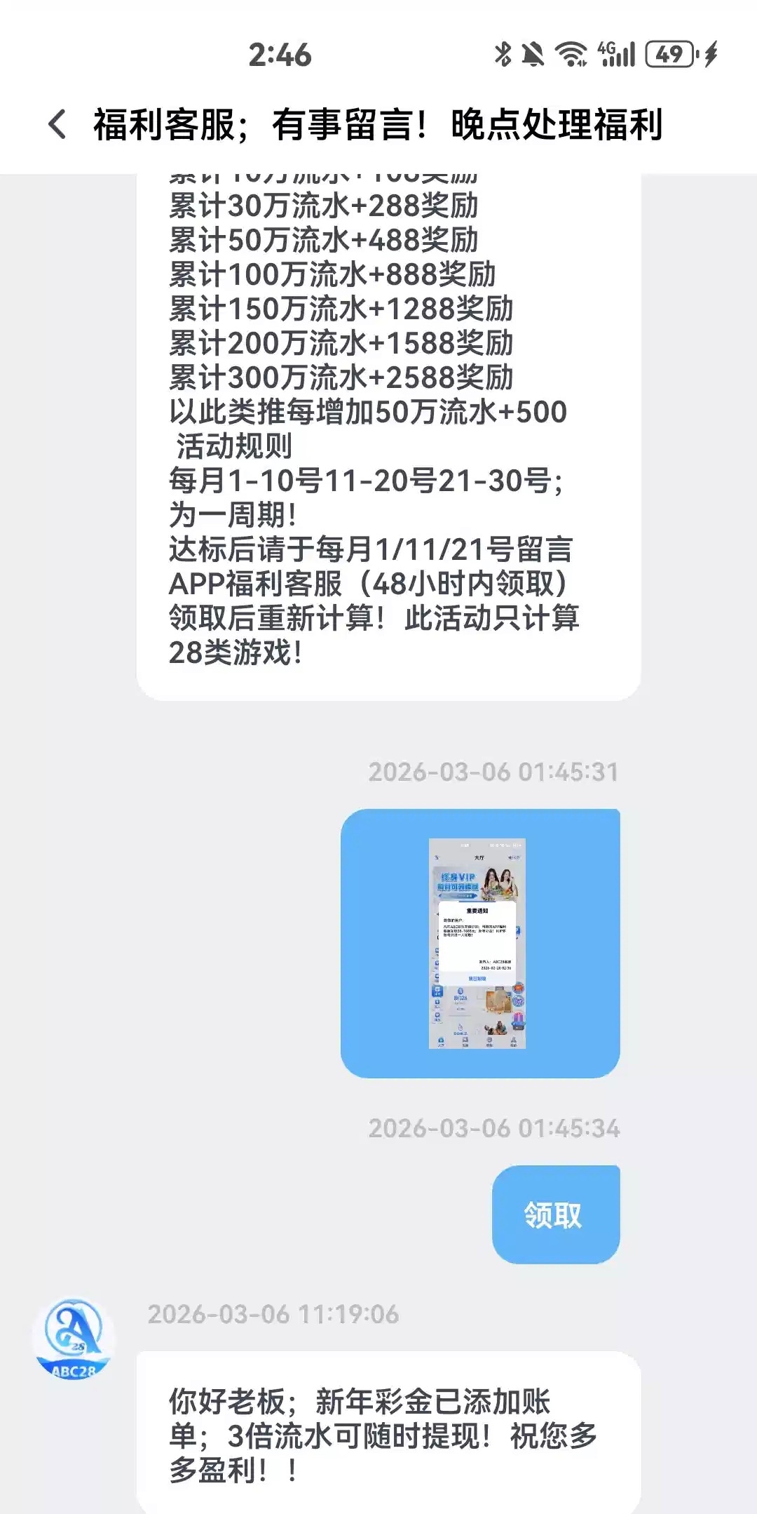 上个月19号领了58,今天月礼金上号看见公告联系福利客服又领了38 链接 abc28.xyz