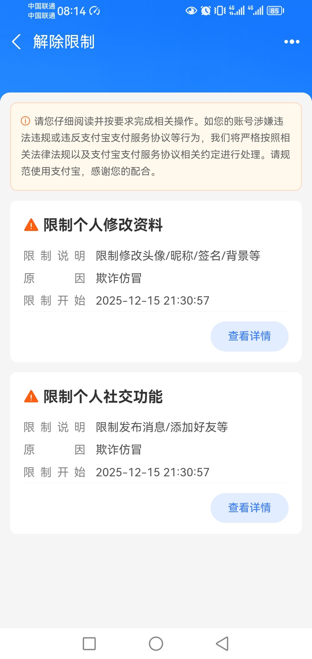 名下三个支付宝全部限制社交功能,请问这个是限制多久,怎么能解开,能提供解决方案的打赏500金币,金币就这么多多了,