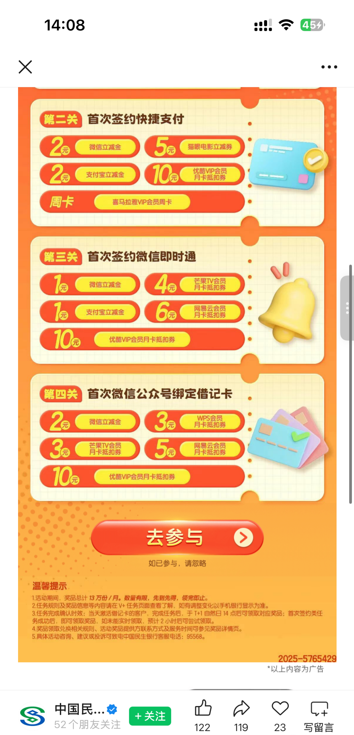 民生去看看有没有这个活动从公众号这个入口进去 然后翻到最下面就有这个入口