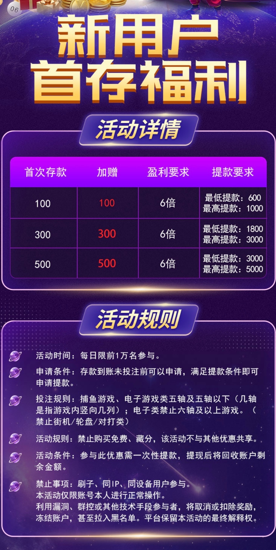 新用户首存100送100,充值后未下注前