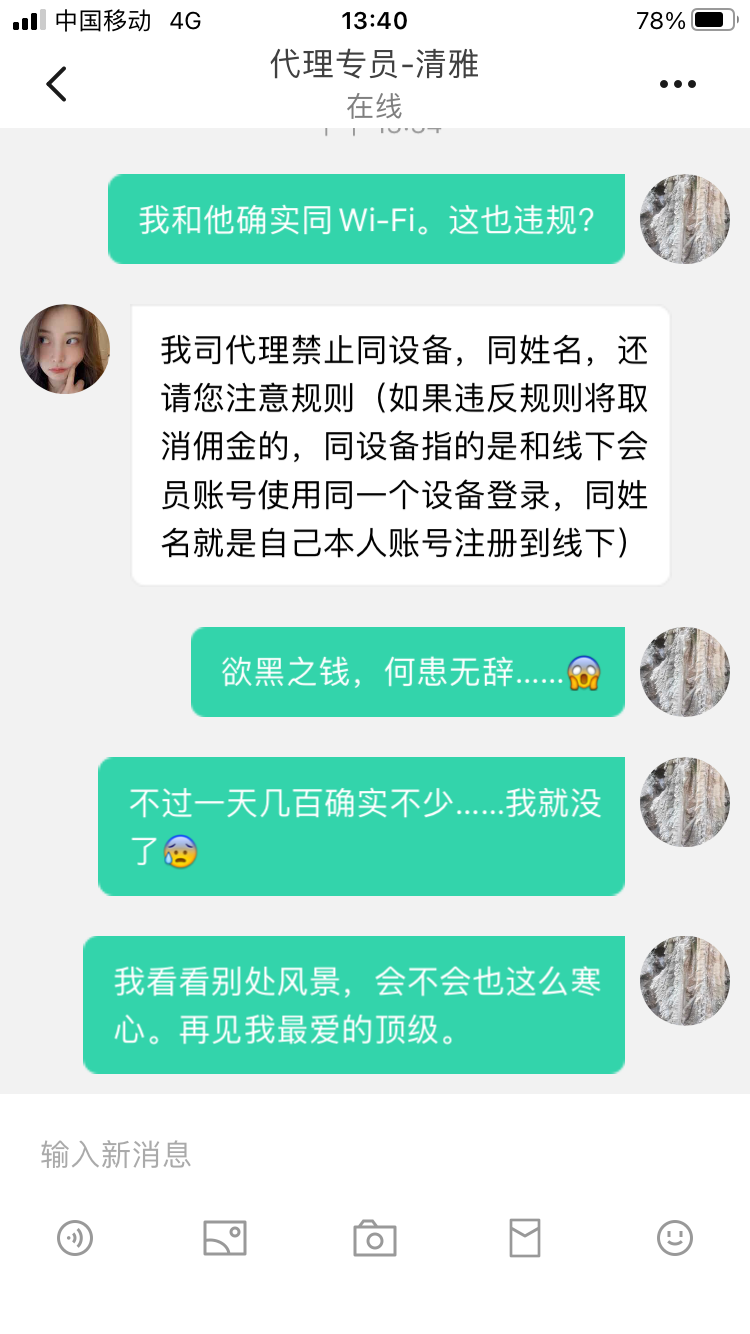 佣金不高时候你随便领,一旦推荐有价值的就各种理由先把佣金扣了。同IP,同姓名,同Wi-Fi(最奇葩)。我现在一天几百上千的佣金啊……就这么给黑了。客户他们留下了,我就一个理由被开了,一个月几万啊。