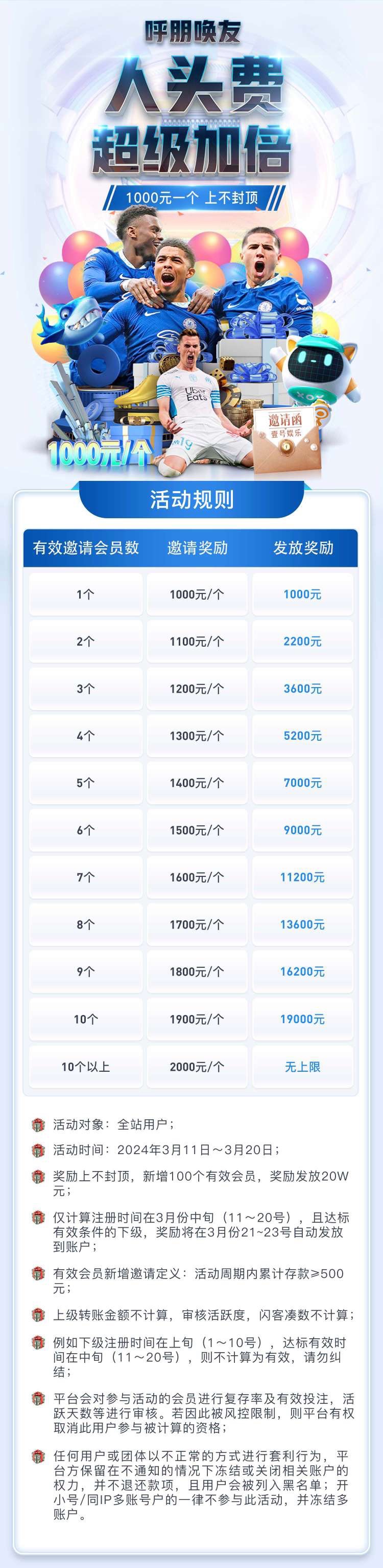 活动期间3月11-3月20日注册达标的用户加倍返利 1000起至2000  10个达标即可领取20000人头费 上不封顶 仅本月中旬一个周期