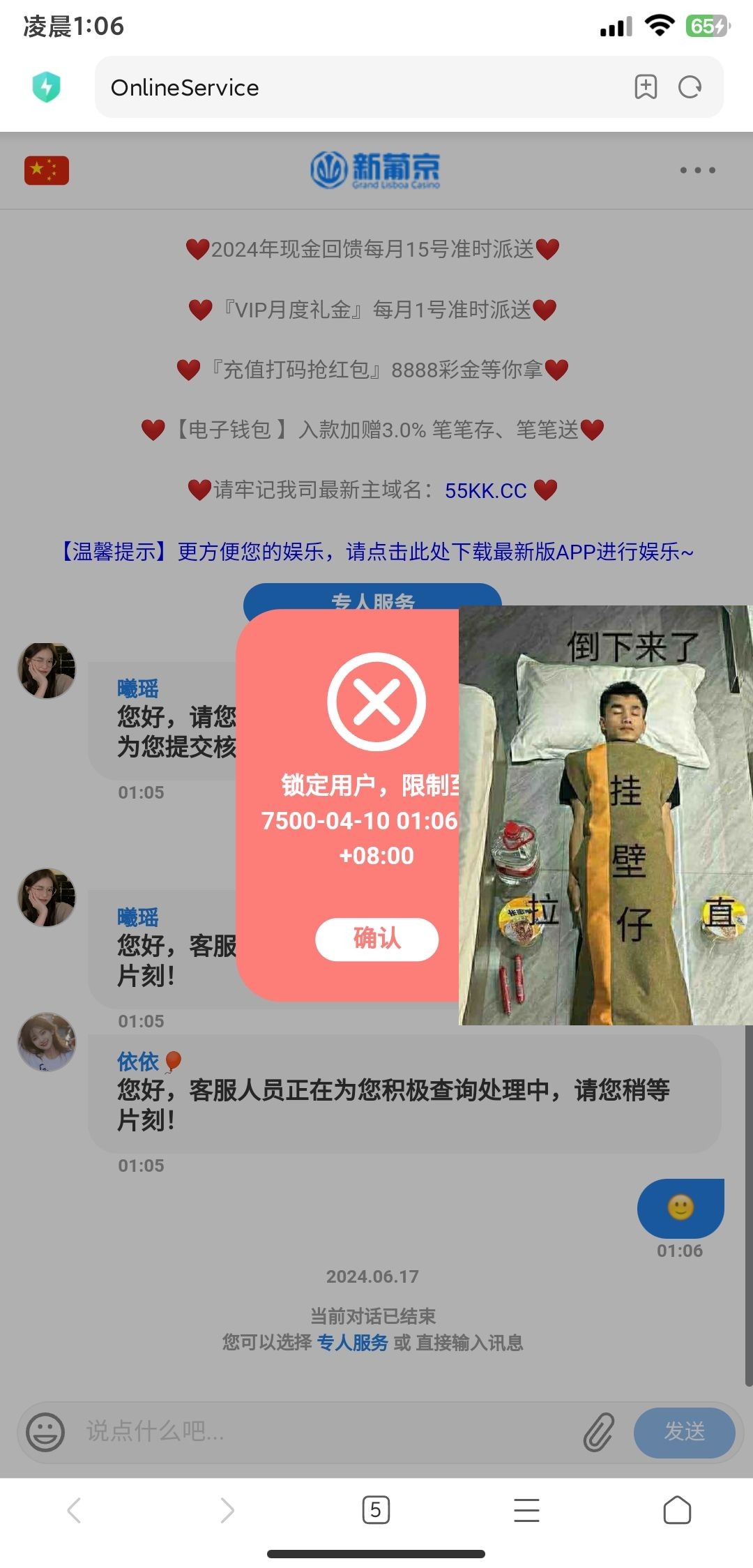 避雷新葡京55kk  这台我4月份注册到现在 基本2周充个一两百 今天刚好充值100上300 提款完后 删后台上来一看要重新登陆就知道事情不一般登陆账号给我封了找客服客服说要给我查查 话没说完也把我ip给拉黑了 玩这台的需谨慎