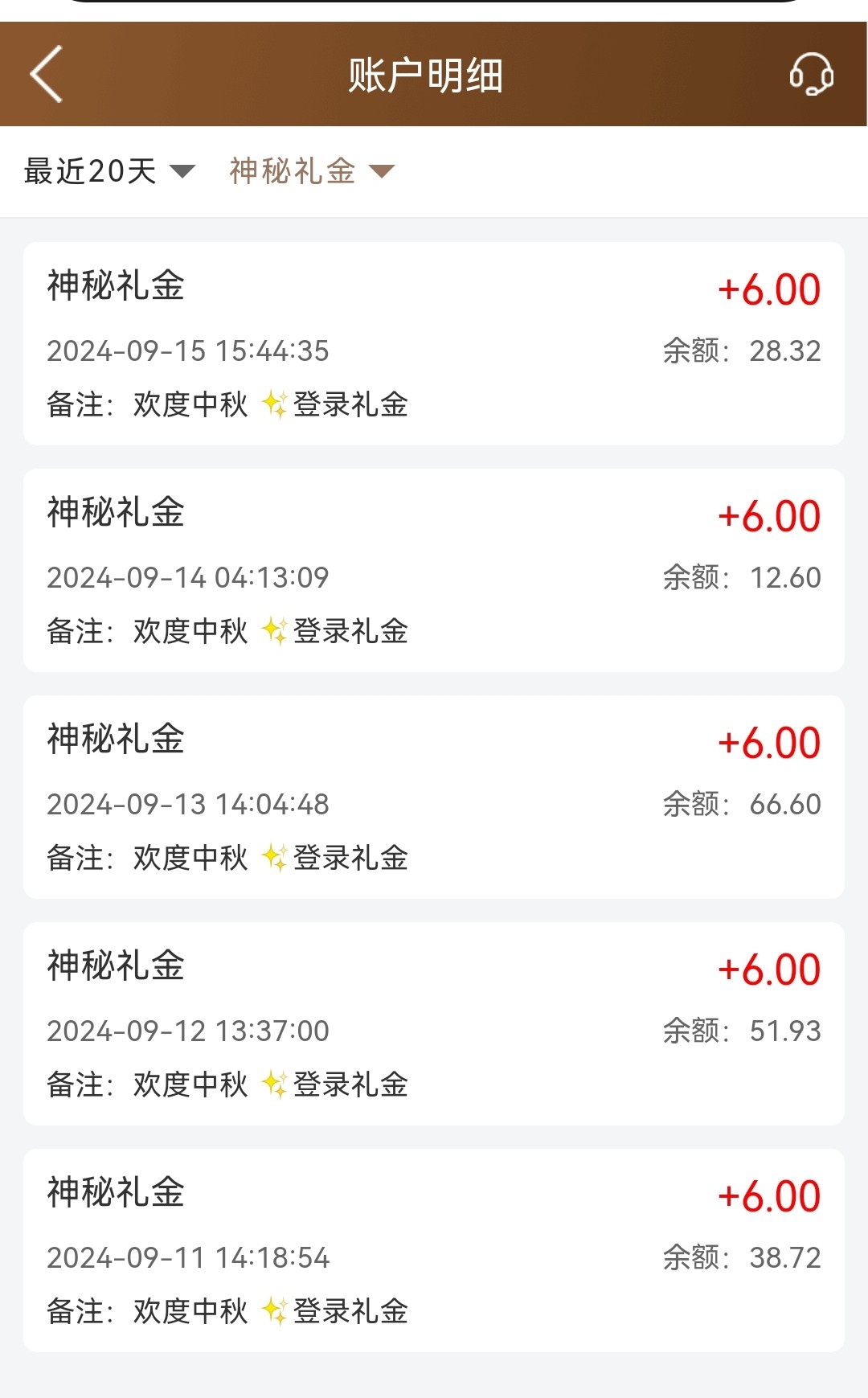 中秋期间每天6彩金,不确定是不是人人有,自己去看。