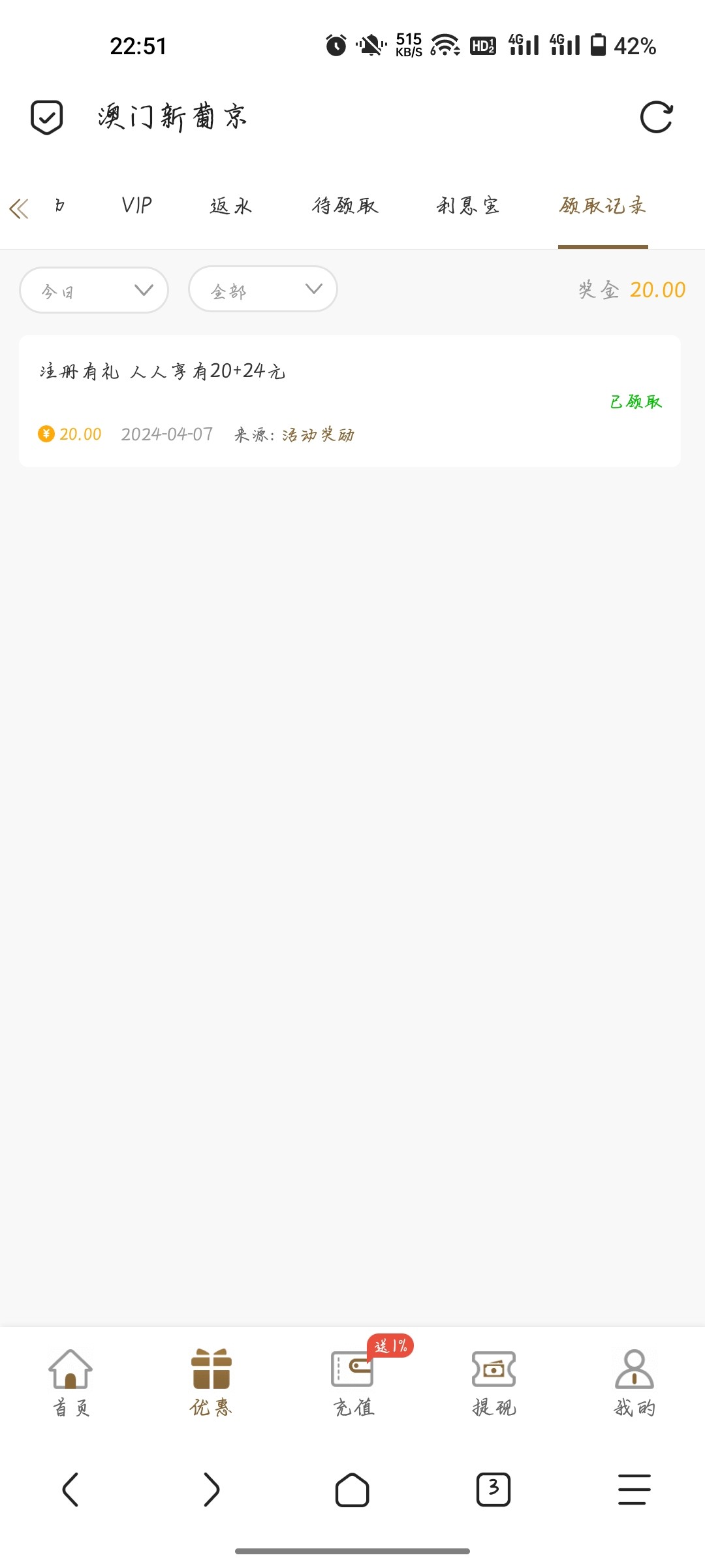 4月25号注册的账号都有19    要去优惠里  更多奖励哪里领取    两个号  一个号提了400    一个号提了220
