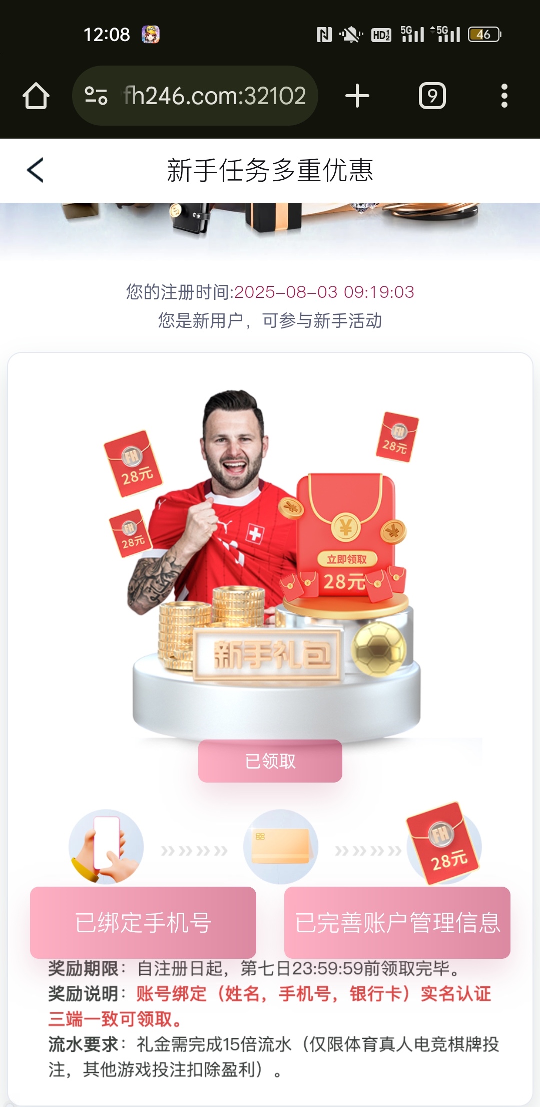 新用户注册绑卡绑定手机号,看图优惠中心自助领取28/100提,彩金只能玩体育真人棋牌。