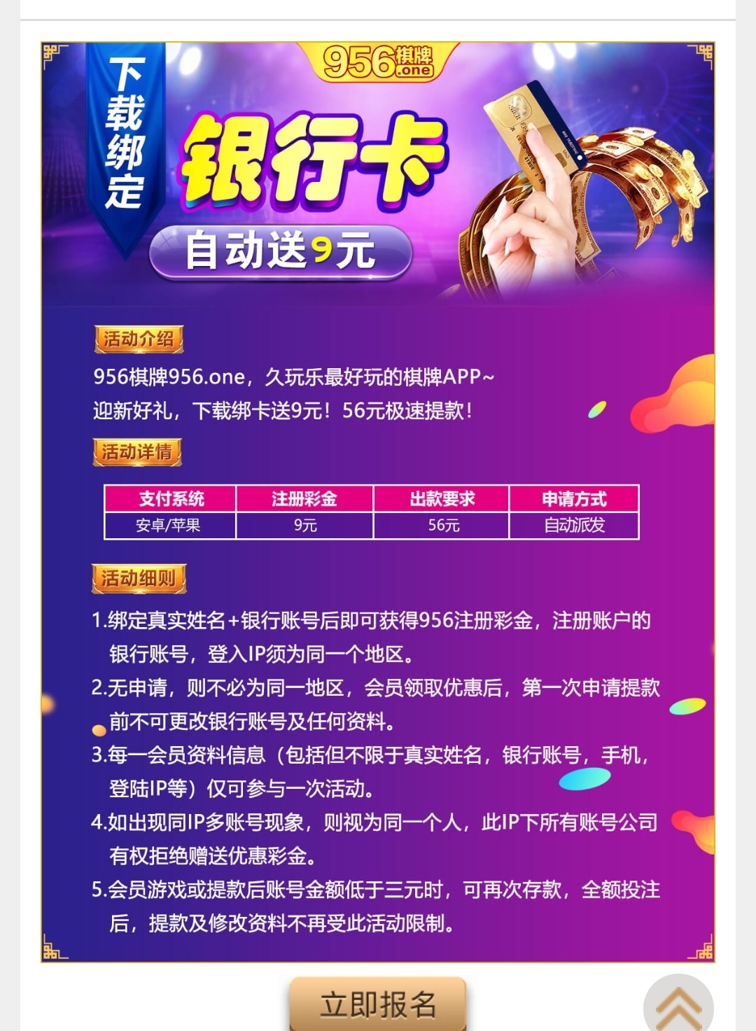 新用户注册绑卡点击活动报名一小时内自动赠送9/56可提