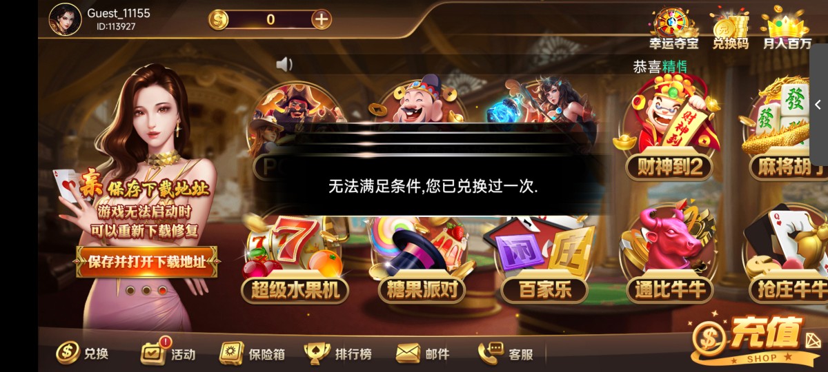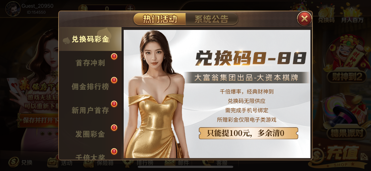 新用户注册下载右上角输入兑换码秒领8~88,兑换码在下方领取,没有金币的在本站首页签到一下就有了,一人仅可领取一次,出款查IP的,请不要刷号领取。首存100送100。