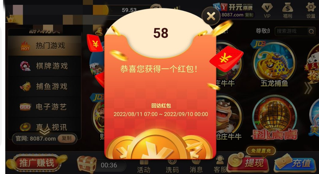 老用户充值过的上线会有回访彩金28/58不等