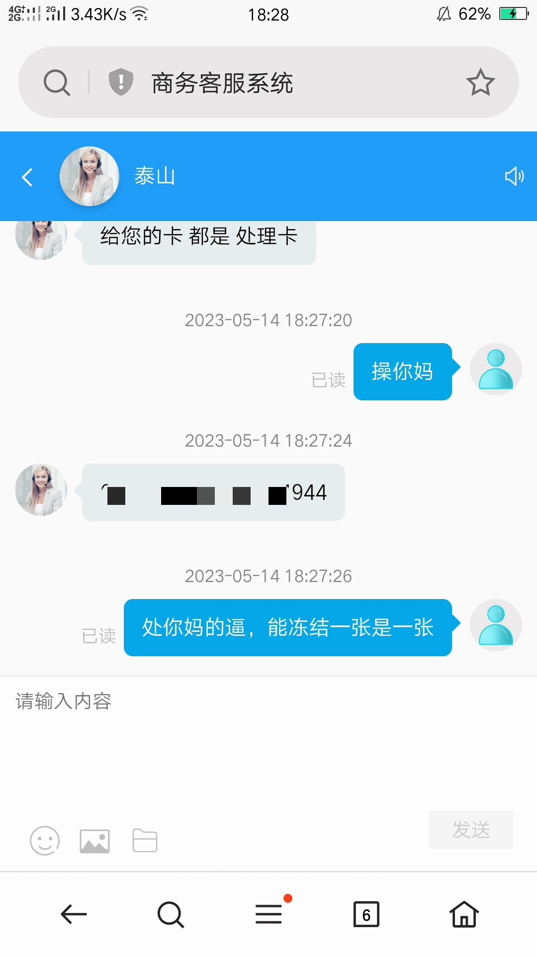 我骗他,我要充值,然后叫了他发几张银行卡,我全部给举报了银行卡给tmd逼全部冻结,然后我就开始骂他,他说叫我等着收钱。我期待他给我打黑钱,然后他就关闭客服聊天了,我手机就一直收到验证码,把他短信轰炸我,你们觉得他会不会打钱