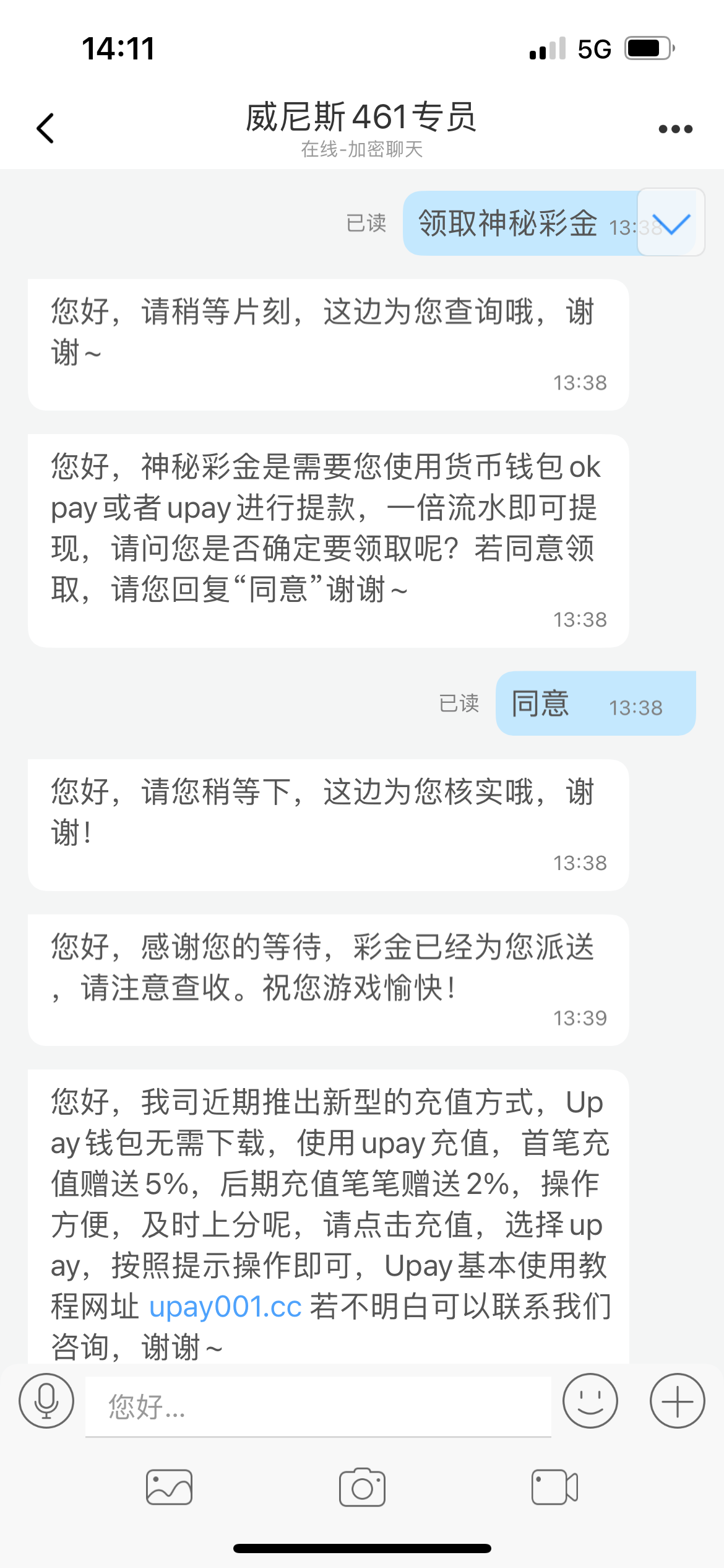 找客服说接到电话通知过来领取彩金,客服会给让你下载添加专员,两个号都送了,看运气没有别狗叫