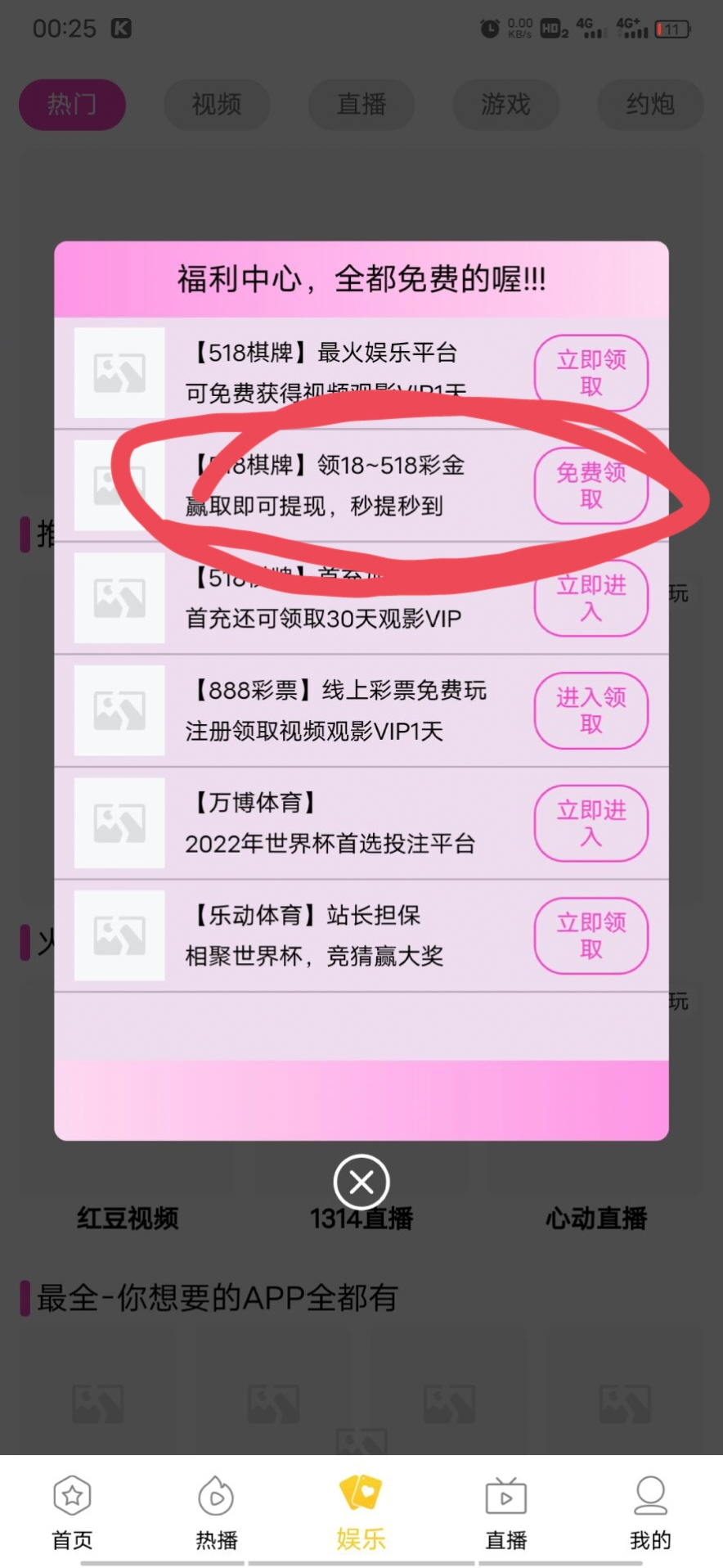 新用户下载红豆APP-点击主页最下角娱乐自动弹出广告点击第二个游戏,注册秒15+有群友反馈送30+最低200即可提现,不会看下图