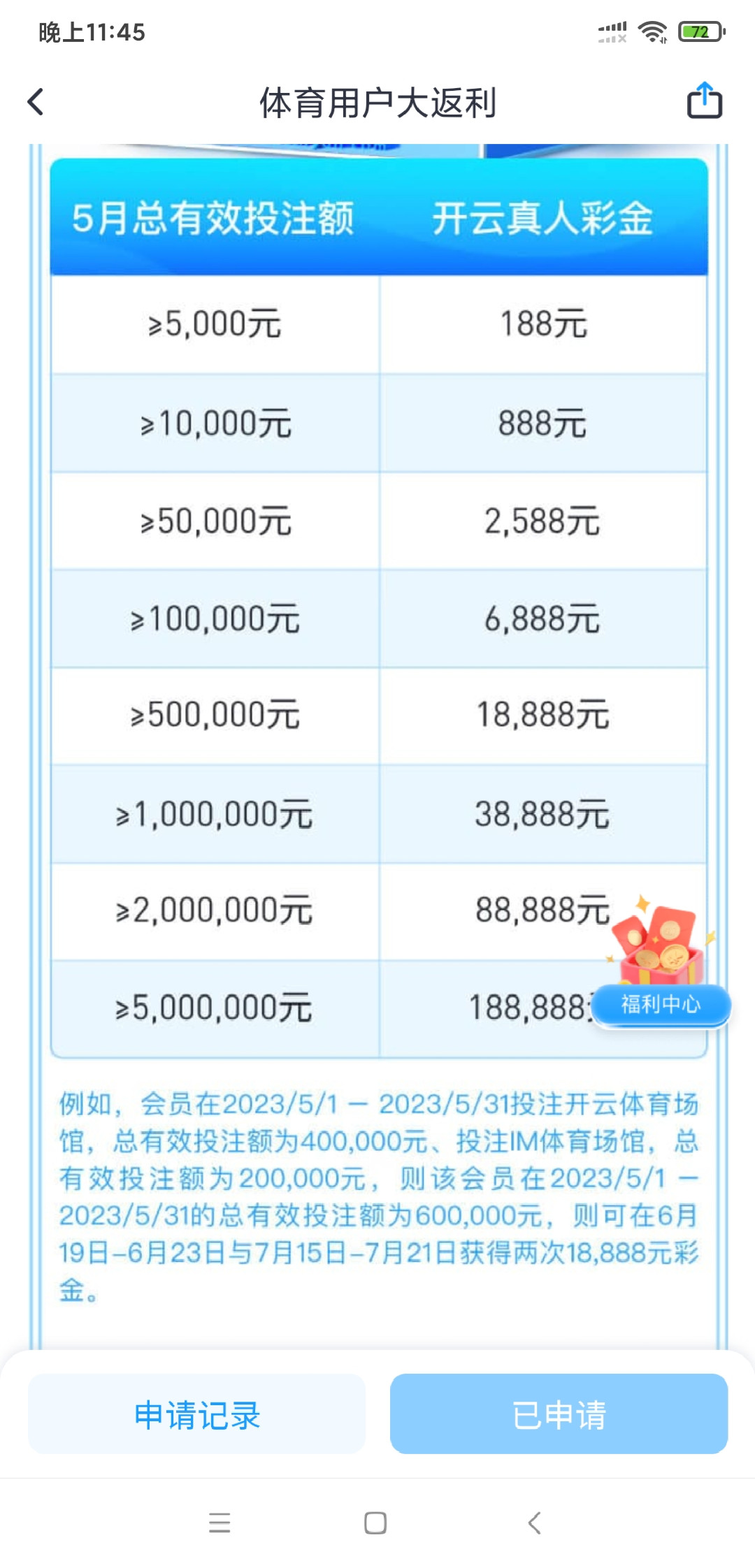五月份在体育场馆流水过5 k以上的都可以申请,不知道流水够不够可以去问客服,申请的人很多彩金到的比较慢,我有好几个哥们都到了6888。