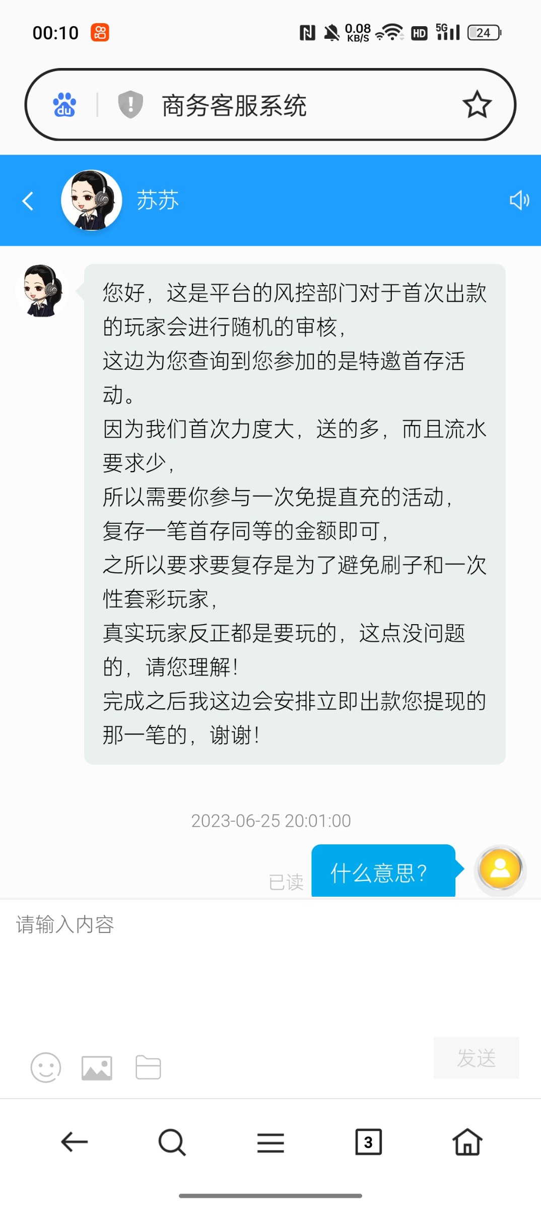 接到个电话说是特邀充多少送多少,充了300送300,打到1000,然后提500,结果说号风控,让复存300解除之后才能提款,结果充了300又说解不了,还让继续复存300,那种充多少说送多少,要求流水低的台子千万别充
